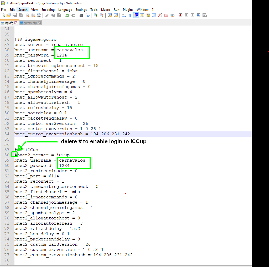 To activate connection to iCCup it is necessary to delete the # before line #bnet2_server = iCCup