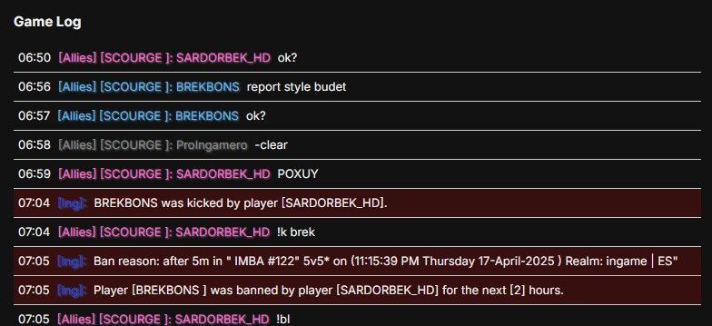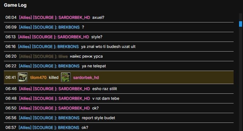 10. Regarding the in-game situation: I used Pit Lord’s ultimate and then activated Tinker’s rockets to kill an enemy in the mid lane. Between the moment I used Pit Lord’s ultimate and triggered Tinker’s rockets, SARDORBEK cast Black Hole. So, essentially, we both initiated our attacks at nearly the same time (with me slightly earlier, considering the burning effect from Pit Lord’s ult). He then accused me of kill stealing (KS), which was clearly not the case. After that, he told me: "I will fuck your mouth" if I steal a kill again. Given that I’m aware of his history of abusing admin powers, I understood this threat as meaning he would kick or ban me. I responded by saying: "I will report to Styla." He then took that as an offense to his supposed untouchable admin status and replied that Styla means nothing to him, after which he immediately kicked and banned me.
